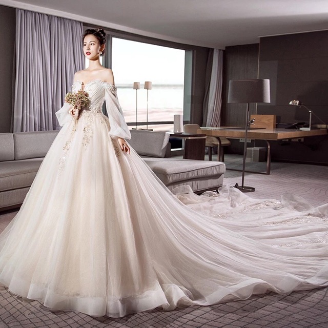 Mẫu váy cưới trễ vai gợi cảm phù hợp với cô dâu hiện đại